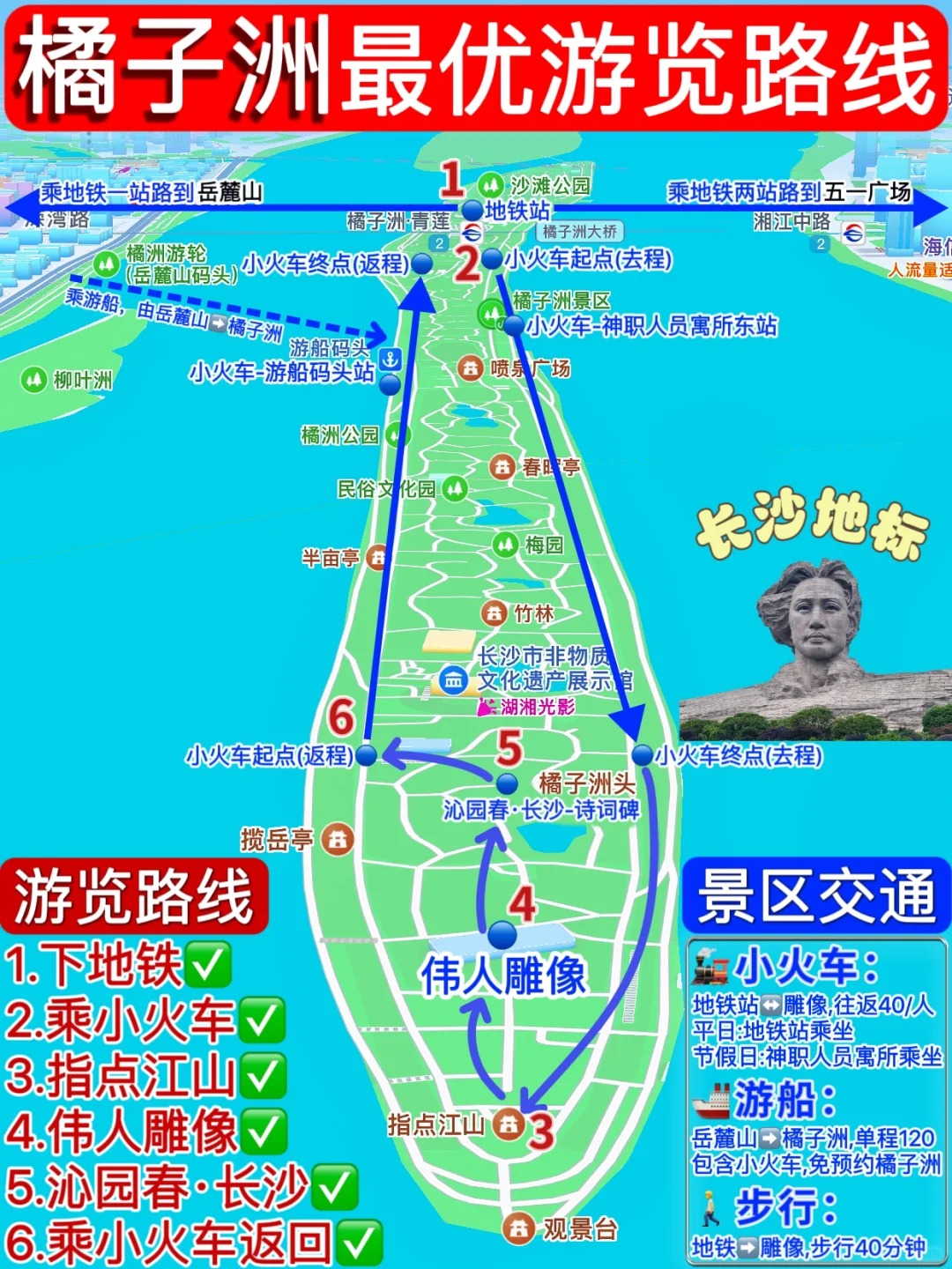 - 岳麓山码头到橘子洲码头,单程120/人,包含小火车往返票。