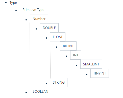 Hive中基本数据类型遵循以下的层次结构,按照这个层次结构,子类型到祖先类型允许隐式转换。例如