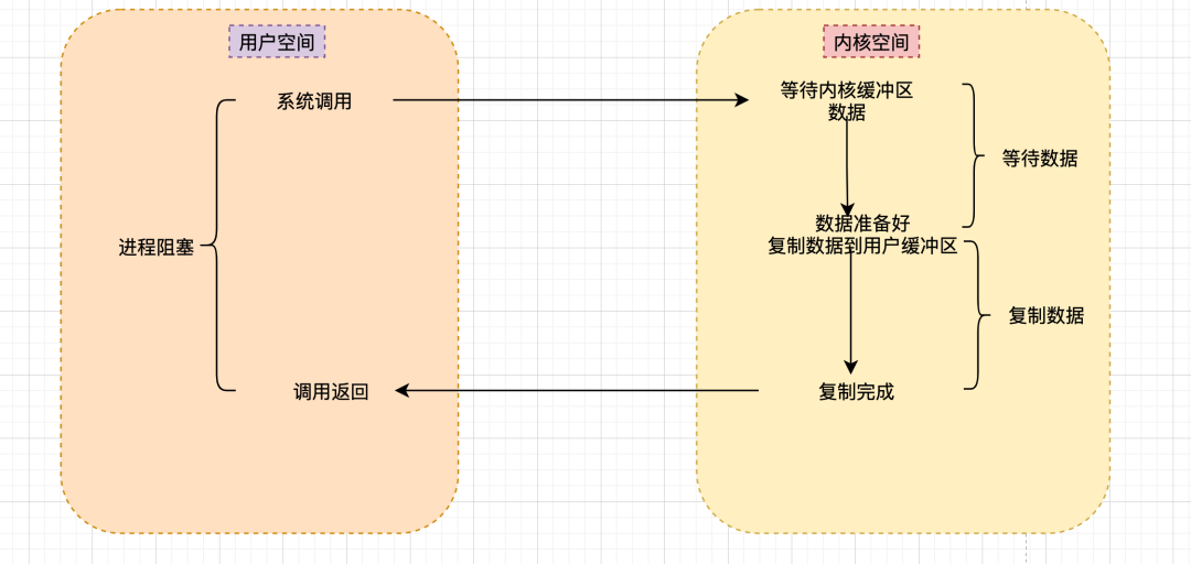用户空间的应用程序执行一个系统调用,这会导致应用程序阻塞,直到数据准备好,并且将数据从内核复制到用户进程。