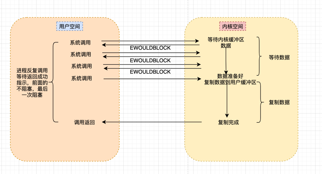 非阻塞的系统调用调用之后,进程并没有被阻塞,内核马上返回给进程,如果数据还没准备好,此时会返回一个error。