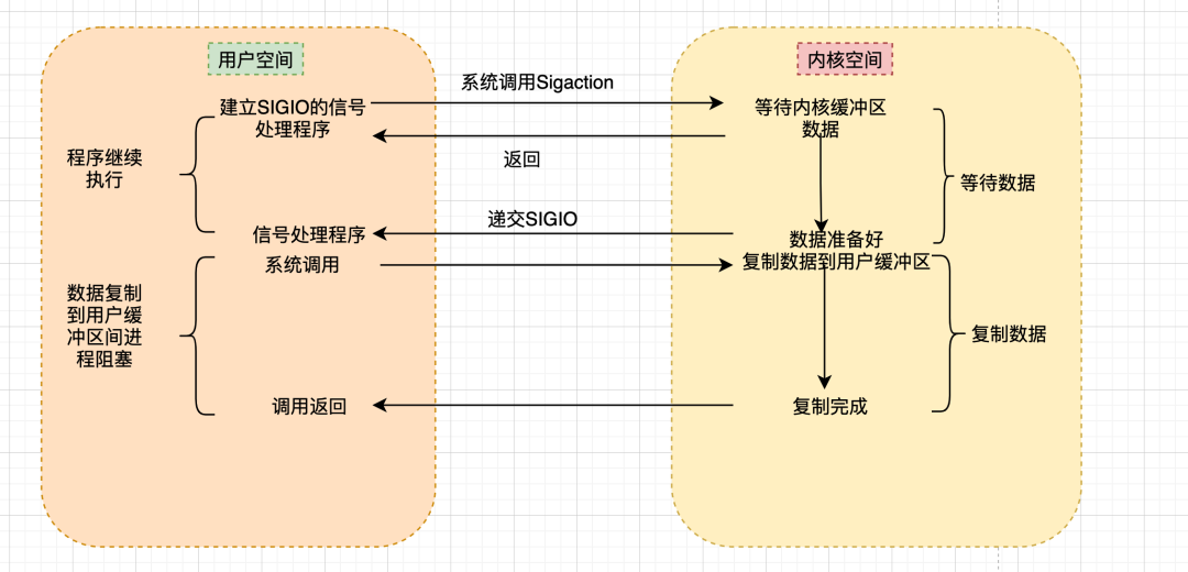 当数据准备好时,进程会收到一个SIGIO信号,可以在信号处理函数中调用I/O操作函数处理数据。