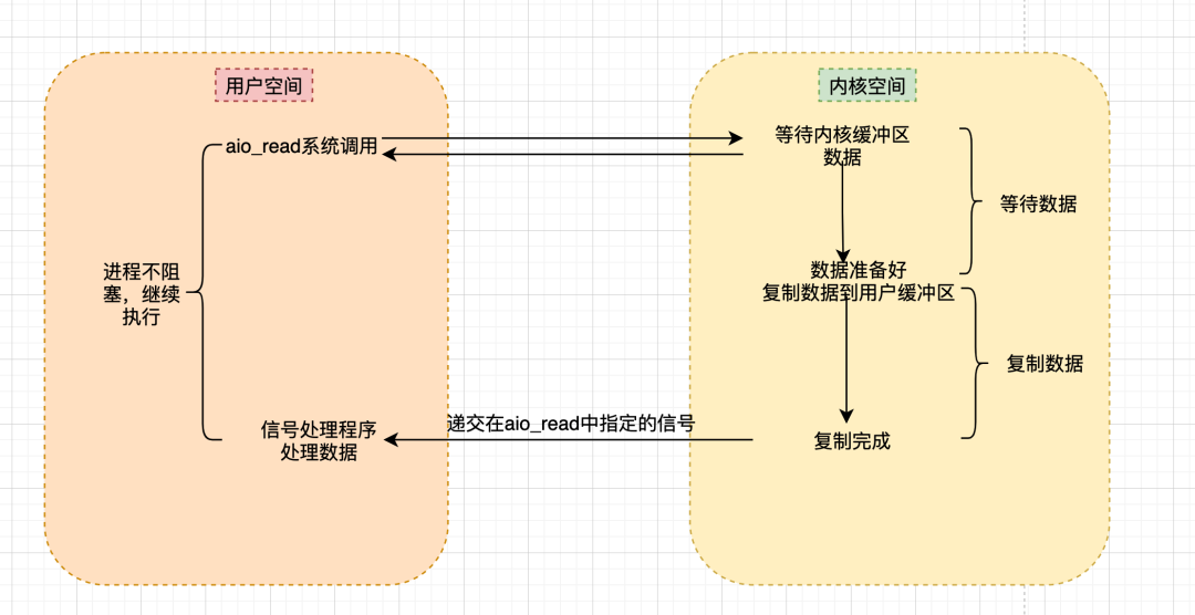 - 而异步IO则由内核通知IO操作何时已经完成(数据已经在用户空间中)。