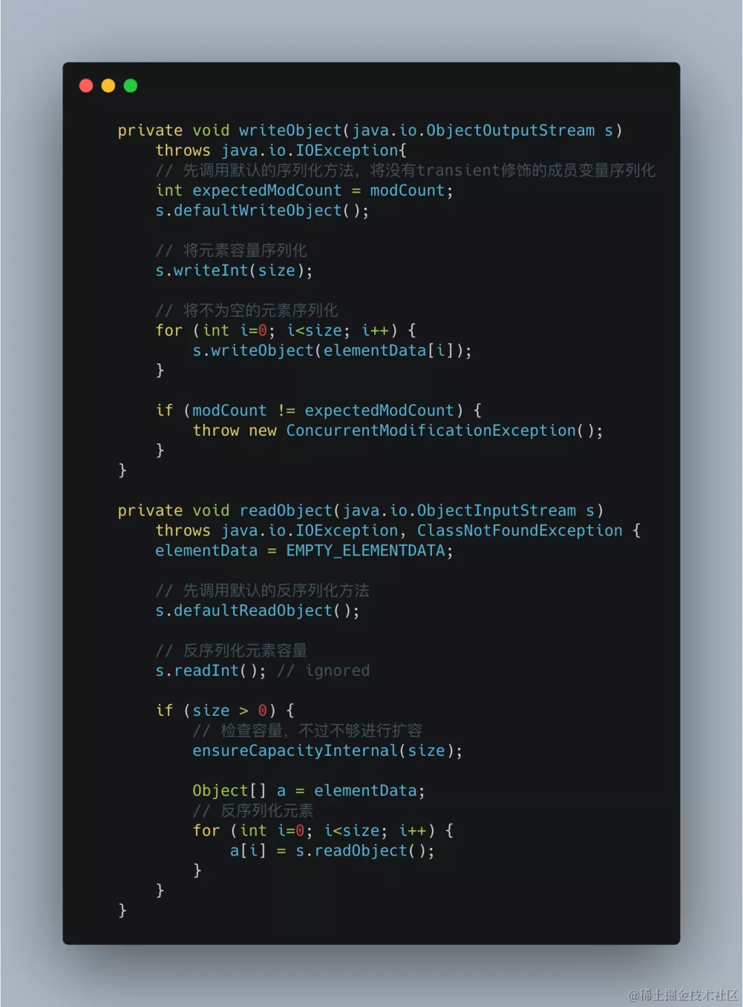 因此使用transient修饰数组,是防止对象数组被其他外部方法序列化。