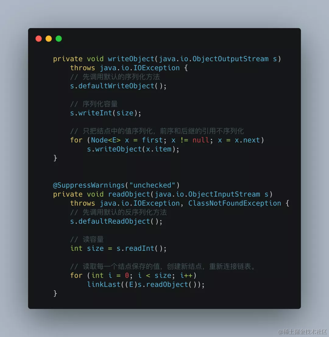 我们可以看到这三个属性都被transient修饰了,原因很简单,我们在序列化的时候不会只对头尾进行序列化,所以LinkedList也是自行实现readObject和writeObject进行序列化与反序列化。