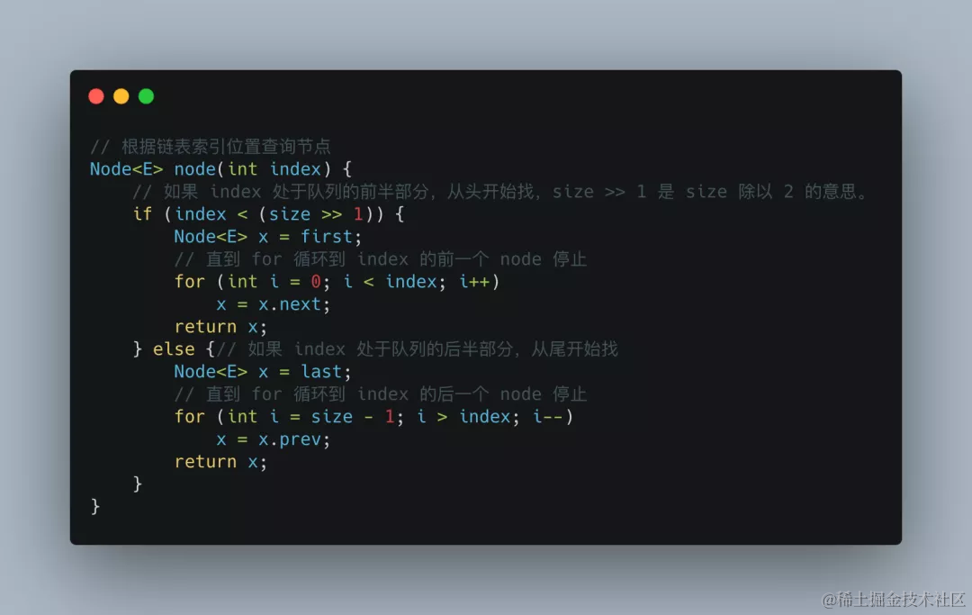 LinkedList 并没有采用从头循环到尾的做法,而是采取了简单二分法,首先看看 index 是在链表的前半部分,还是后半部分。