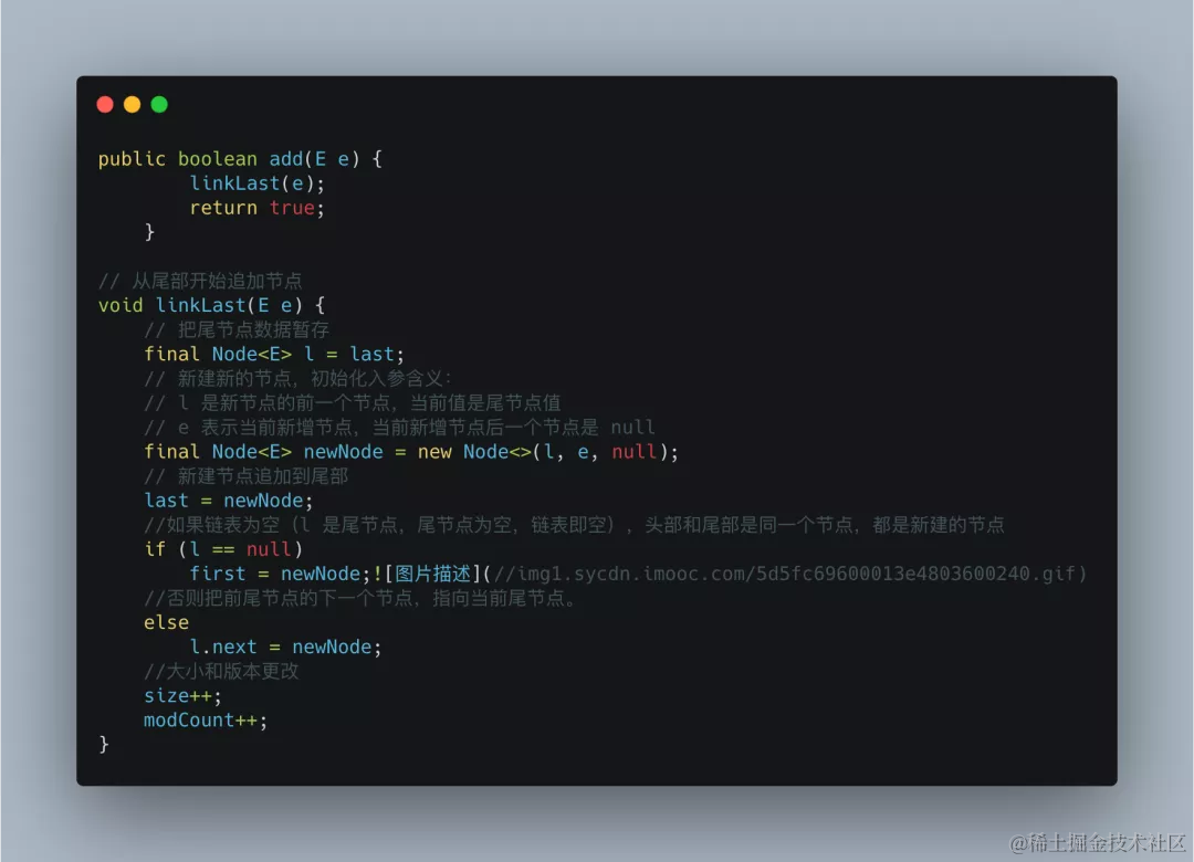 默认的add (Ee)方法是将添加的元素加到队尾,首先是将last元素置换到临时变量中,生成一个新的Node节点对象,然后将last引用指向新节点对象,之前的last对象的前指针指向新节点对象。