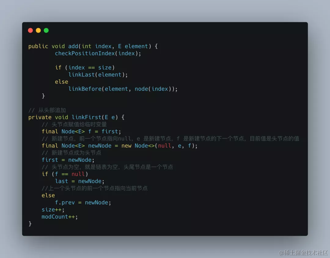LinkedList是基于链表实现,在添加元素的时候,首先会通过循环查找到添加元素的位置,如果要添加的位置处于List的前半段,就从前往后找;若其位置处于后半段,就从后往前找,因此LinkedList添加元素到头部是非常高效的。