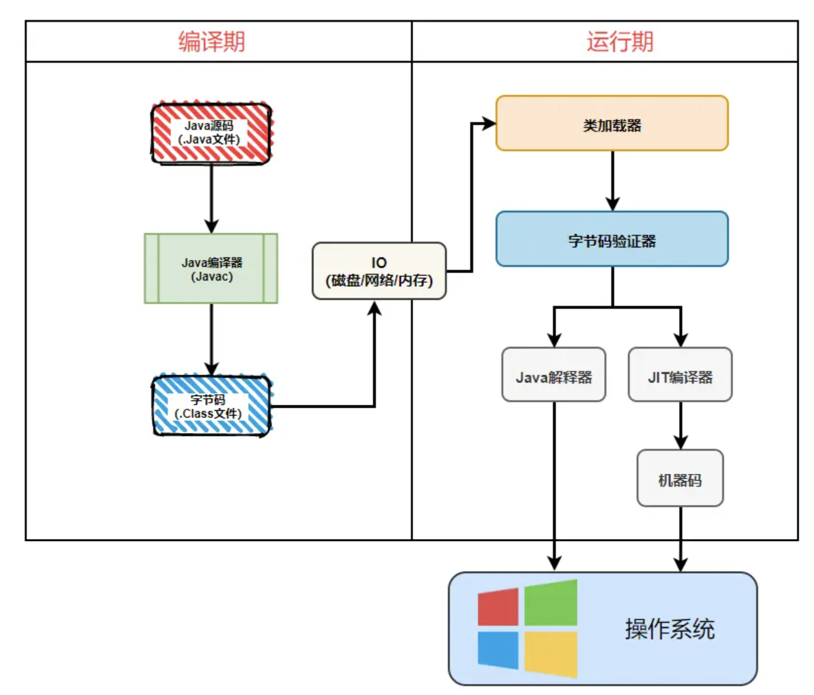 Java中就是把.java文件编译成.class文件,再把编译后的文件交给JVM加载执行。