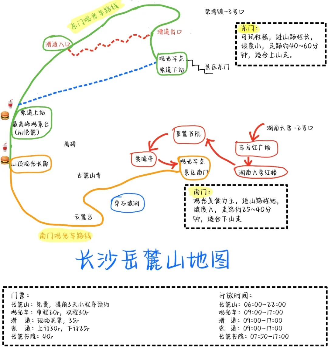 地铁2号线「溁湾镇站」3号口出→步行五分钟到达岳麓山东门→索道/观光车上山→山顶观光长廊→观光车下山到岳麓山南门→岳麓书院/爱晚亭→美食街→返回。