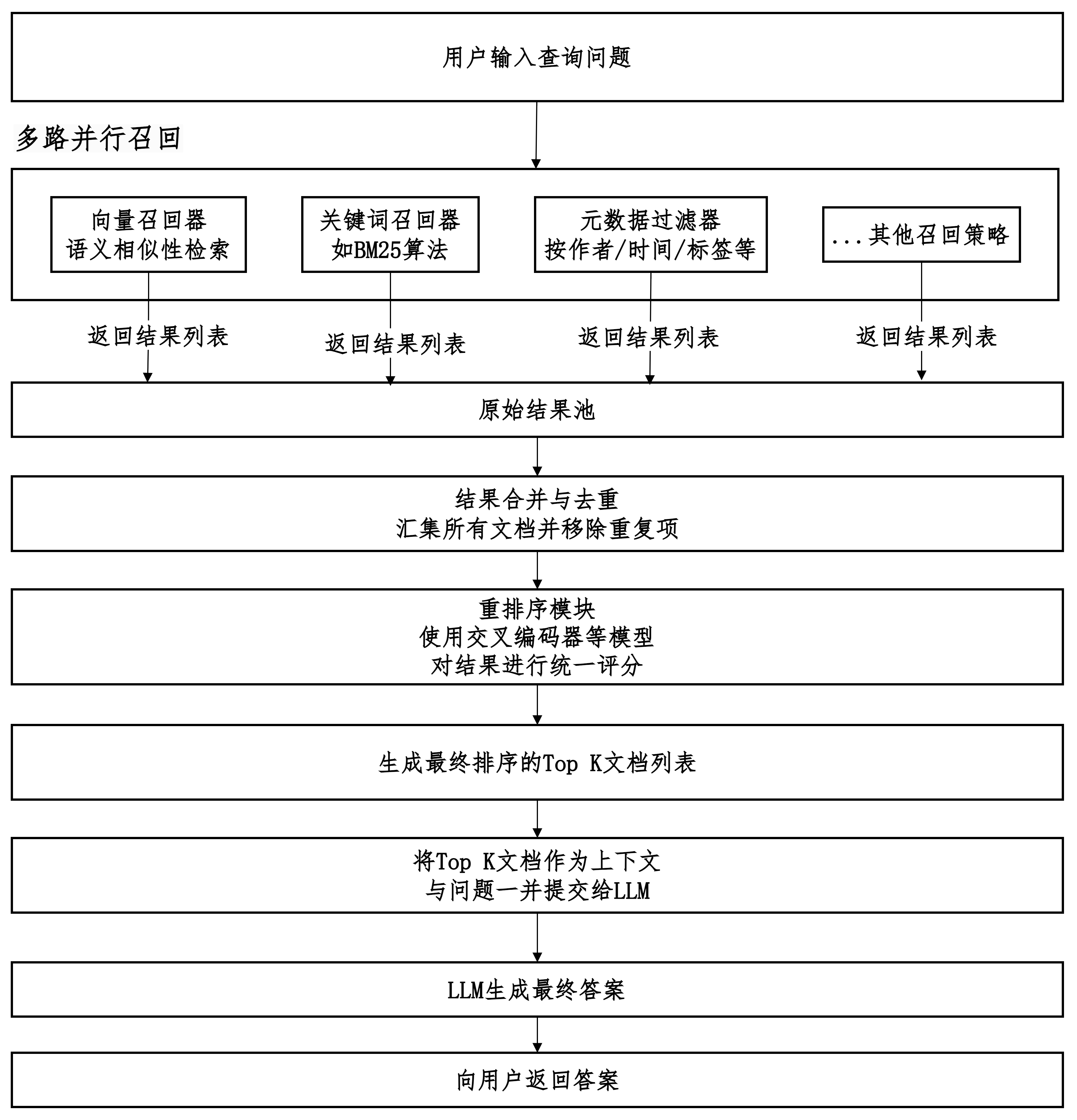 然后将各路的结果进行合并、去重和排序,最终筛选出最相关的结果集合。